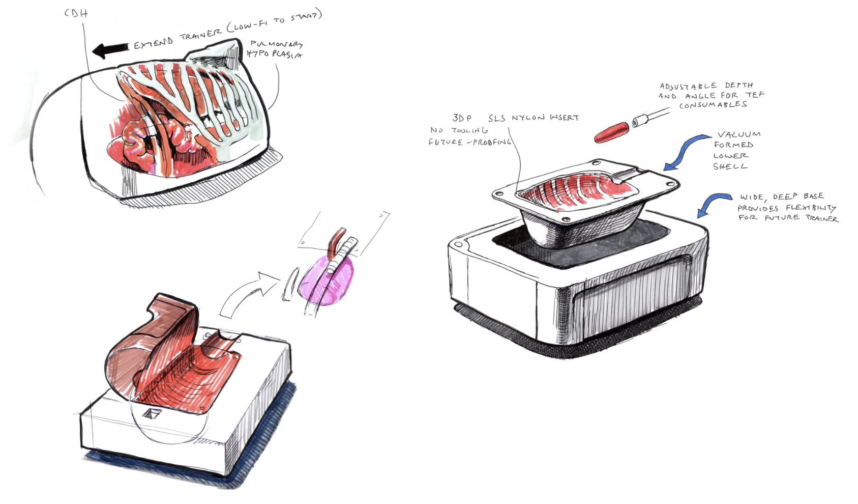 Redesigned a lapraroscopic surgical skills trainer for the repair of tracheoesophageal fistula in neonatal patients. Improvements included a fully-digital design (previous design was an artisan sculpt and hand-made molds), replacing the monolithic chest with a reusable frame and a chest wall cartridge that can be swapped out when it becomes worn.